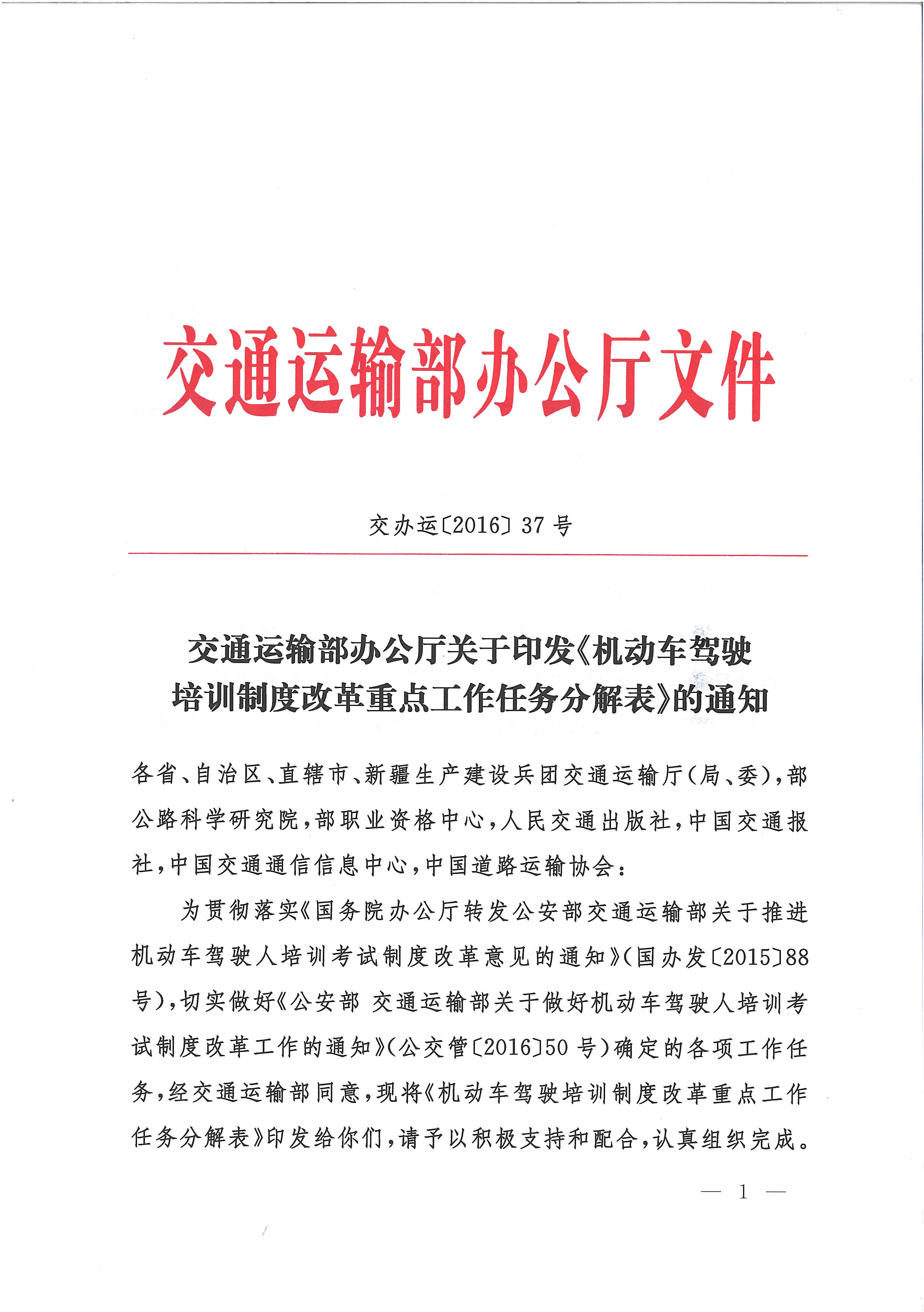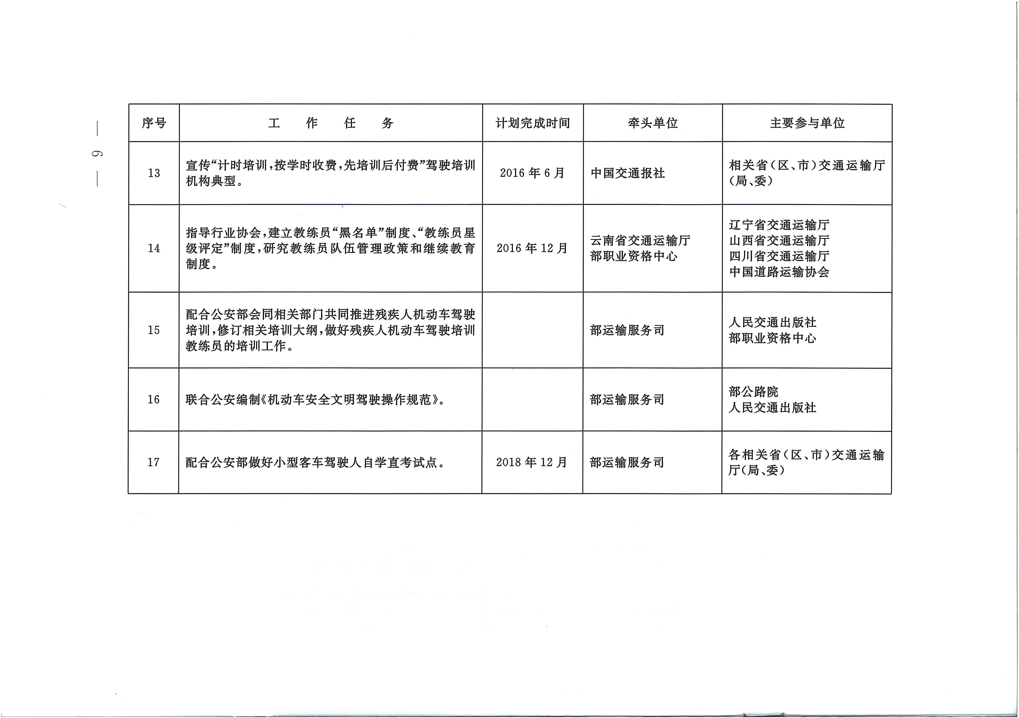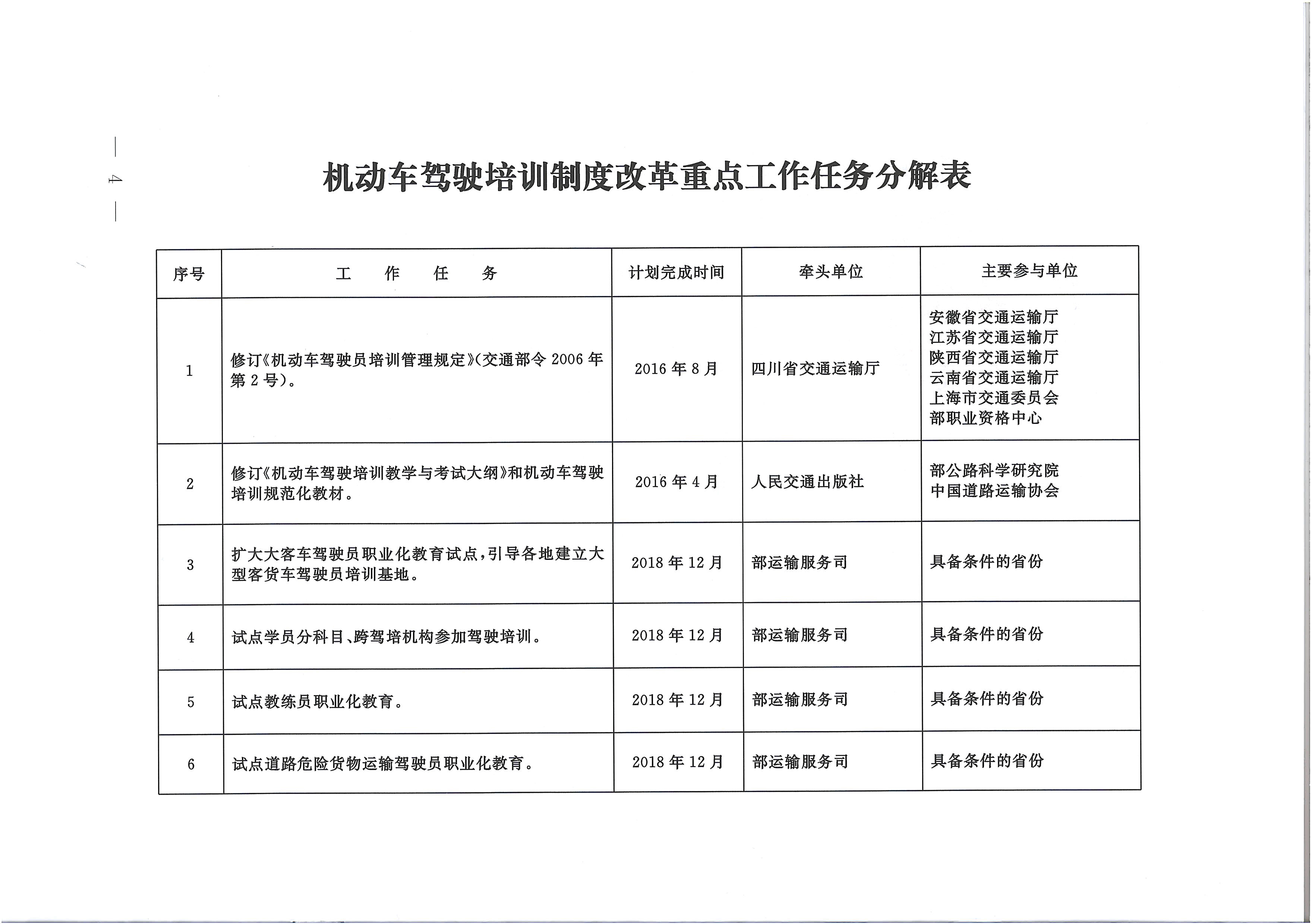 交通运输部办公厅关于印发《机动车驾驶员培训改革重点工作任务》分解表的通知